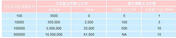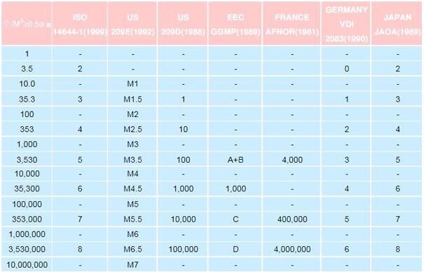 基于≥0.5μm粒徑的各國無塵車間潔凈度等級近似對照表